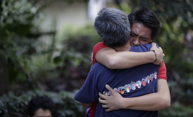 Men hug, crying with joy, as they reunite hours after an earthquake in the Condesa neighborhood of Mexico City, Tuesday, Sept. 19, 2017. A 7.1 earthquake stunned central Mexico, killing more than 100 people as buildings collapsed in plumes of dust. (AP Photo/Rebecca Blackwell)
