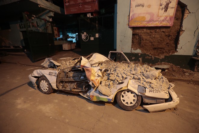A car stands crushed by rubble after a 7.1 earthquake, in Jojutla, Morelos state, Mexico, Tuesday, Sept. 19, 2017. The earthquake stunned central Mexico, killing more than 100 people as buildings collapsed in plumes of dust. (AP Photo/Eduardo Verdugo)