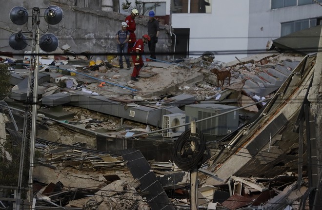 A rescue dog helps workers look for people trapped under the rubble of a collapsed building in Mexico City, Tuesday, Sept. 19, 2017. A 7.1 earthquake stunned central Mexico, killing more than 100 people as buildings collapsed in plumes of dust. (AP Photo/Rebecca Blackwell)
