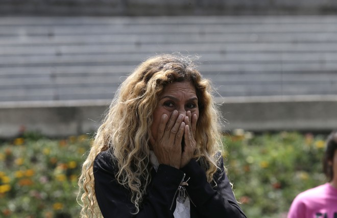 A woman reacts as people evacuate along Paseo del la Reforma Avenue after an earthquake in Mexico City, Tuesday, Sept. 19, 2017. A powerful earthquake jolted central Mexico on Tuesday, causing buildings to sway sickeningly in the capital on the anniversary of a 1985 quake that did major damage. (AP Photo/Marco Ugarte)