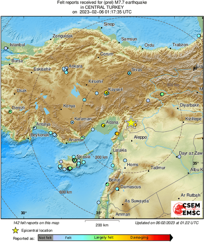 Το Τμήμα Γεωλογικής Επισκόπησης ανακοινώνει ότι την Δευτέρα 06 Φεβρουαρίου 2023 και τοπική ώρα 03:17 καταγράφηκε από τους σεισμολογικούς σταθμούς του Τμήματος η πολύ ισχυρή σεισμική δόνηση που έγινε στην περιοχή του Γκαζαντιέπ (κοντά στα σύνορα με τη Συρία) με μέγεθος ροπής Μw=7.8.