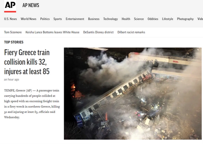 Την ίδια ώρα το AP σημειώνει: «Σφοδρή σύγκρουση τρένων στην Ελλάδα με νεκρούς και τραυματίες».