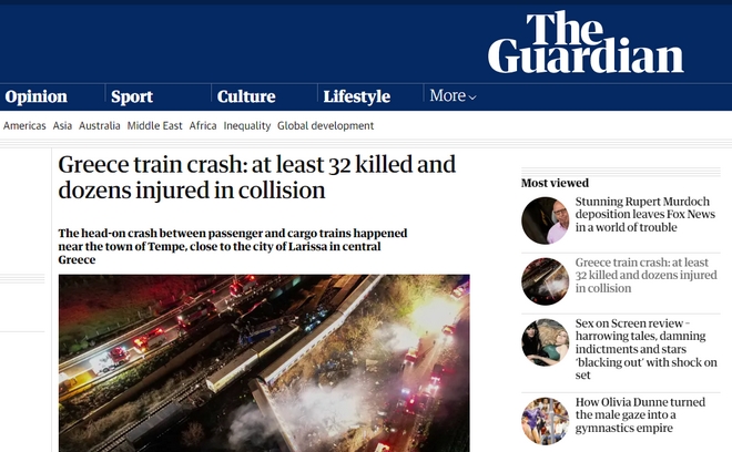 Ο Guardian αναφερόμενος στην τραγωδία γράφει ότι «τουλάχιστον 36 άνθρωποι σκοτώθηκαν και 85 τραυματίστηκαν μετά τη σύγκρουση δύο τρένων κοντά στην πόλη των Τεμπών στην κεντρική Ελλάδα, ανακοίνωσε η πυροσβεστική».