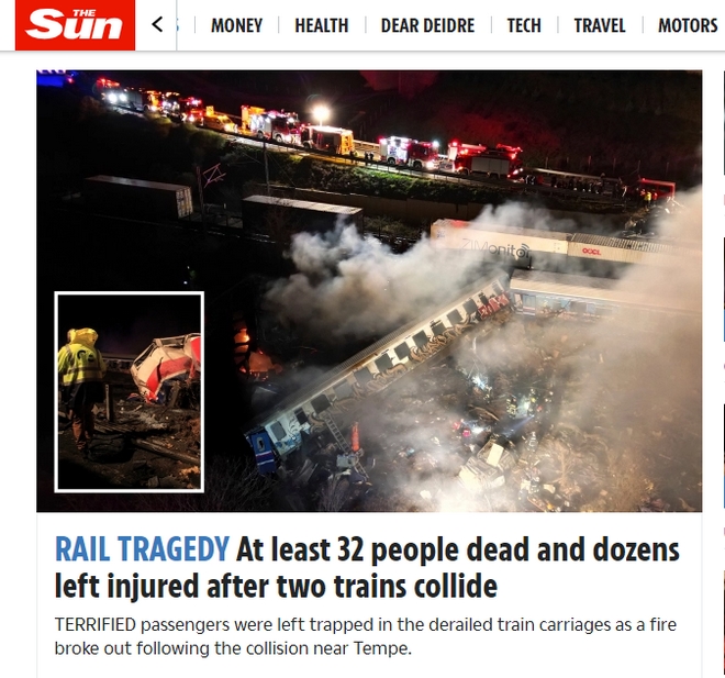 Πρώτο θέμα και στο BBC η τραγωδία στα Τέμπη με το μεγάλο μέσο ενημέρωσης να γράφει: «Μια αμαξοστοιχία που λέγεται ότι μετέφερε περίπου 350 επιβάτες συγκρούστηκε με μια εμπορική αμαξοστοιχία που ταξίδευε προς την αντίθετη κατεύθυνση κοντά στην πόλη της Λάρισας αργά το βράδυ της Τρίτης».
