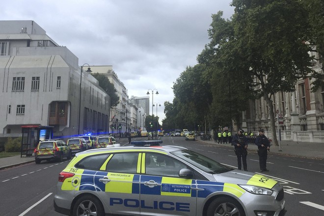 Britain's Police at the scene of an incident in central London, Saturday, Oct. 7, 2017. London police say emergency services are outside the Natural History Museum in London after a car struck pedestrians. (AP Photo/Alastair Grant) ap