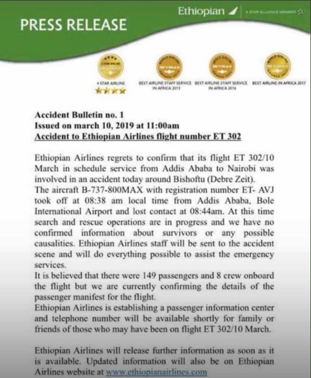 «Το γραφείο του πρωθυπουργού, εκ μέρους της κυβέρνησης και του λαού της Αιθιοπίας, εκφράζει τα βαθύτερα συλλυπητήριά του στις οικογένειες που έχασαν τους αγαπημένους τους στο Μπόινγκ 737 των Αιθιοπικών Αερογραμμών που ήταν προγραμματισμένη για το Ναϊρόμπι της Κένυας σήμερα το πρωΐ», τονίζεται στο Twitter του πρωθυπουργού.