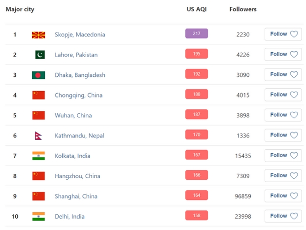 Σύμφωνα με την ιστοσελίδα της ΑirVisual, που κάνει τις σχετικές μετρήσεις, τα Σκόπια ήταν τη Δευτέρα το πρωί η πιο μολυσμένη πόλη στον κόσμο με το νούμερο να ξεπερνά το 200 (δείκτης ποιότητας αέρα).
