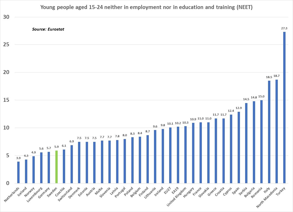 Ένας πιο ενδεικτικός πάντως πίνακας του τι πραγματικά συμβαίνει είναι ο παρακάτω. Καταγράφει την ανεργία στους νέους που δεν βρίσκονται ούτε στην εκπαίδευση, ούτε σε εργασία, και εκεί τα νούμερα για την Ελλάδα παραμένουν αρκετά υψηλά, σε αντίθεση με τη Σουηδία και τις Σκανδιναβικές χώρες.