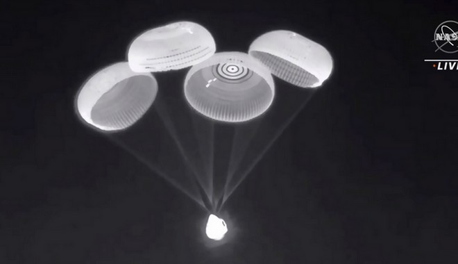 Χειροκροτήματα ακούστηκαν από το κέντρο ελέγχου πτήσης καθώς τα τέσσερα αλεξίπτωτα άνοιξαν πάνω από την κάψουλα, μειώνοντας την ταχύτητα στα 24 χιλιόμετρα την ώρα και ρίχνοντάς τα ήρεμα στη θάλασσα.