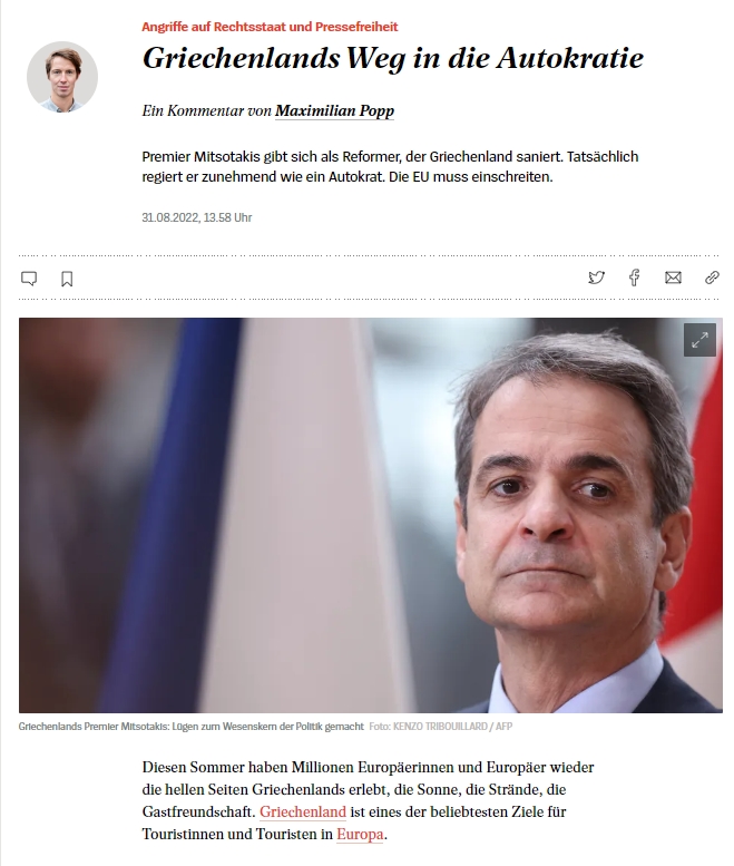Όπως αναφέρει το γερμανικό portal στο άρθρο του, “η Ελλάδα είναι ένας από τους πιο δημοφιλείς τουριστικούς προορισμούς στην Ευρώπη, κάτι που είδαν και φέτος το καλοκαίρι εκατομμύρια Ευρωπαίοι”. “Η φωτεινή πλευρά της Ελλάδας είναι ο ήλιος, οι παραλίες, η φιλοξενία”, αναφέρει το γερμανικό Μέσο. Και συνεχίζει: “Ίσως γι’ αυτό οι κυβερνήσεις στις άλλες ευρωπαϊκές πρωτεύουσες είναι πιο πρόθυμες να παραβλέψουν τη σκοτεινή πλευρά του εταίρου τους στην ΕΕ. Η διάλυση της δημοκρατίας στην Ουγγαρία και την Πολωνία απασχολεί τα δικαστήρια και την Επιτροπή της ΕΕ. Το γεγονός ότι η Ελλάδα, υπό τον δεξιό συντηρητικό πρωθυπουργό Κυριάκο Μητσοτάκη, διολισθαίνει ολοένα και περισσότερο προς την κατεύθυνση της απολυταρχίας, φαίνεται ότι δεν ενόχλησε σχεδόν κανέναν στις Βρυξέλλες, στο Βερολίνο και στο Παρίσι”.