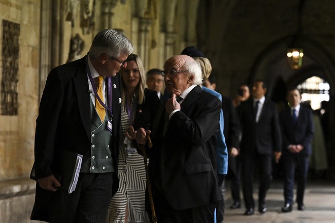 Αρχηγοί κρατών, εκπρόσωποι υπερπόντιων κυβερνήσεων, υπουργοί της κυβέρνησης της Βρετανίας, πρώην πρωθυπουργοί, μέλη βασιλικών οικογενειών, αναφώνησαν "God Save the King" στο Αβαείο του Γουέστμινστερ προς τιμήν του βασιλιά Καρόλου Γ'.
