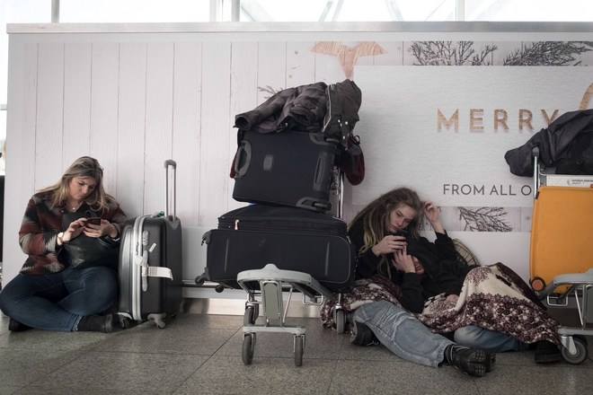 Passengers sit in Stansted Airport terminal, Thursday Dec. 28, 2017, where some passengers were stranded overnight after flights were cancelled due to weather conditions. Met Office forecasters said Britain may face the coldest night of the year so far on Thursday and said snow predicted for parts of northern England may spread to a wider area. (Stefan Rousseau/PA via AP) AP