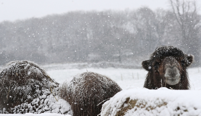 A camel stands in the snow at Mainsgill Farm near Richmond, in North Yorkshire, England, Friday, Dec. 29, 2017. Britain saw one of the coldest nights of the year with temperatures falling to minus 12.3C at Loch Glascarnoch in the Scottish Highlands overnight and heavy snow expected over parts of the north of England. (Owen Humphreys/PA via AP) AP