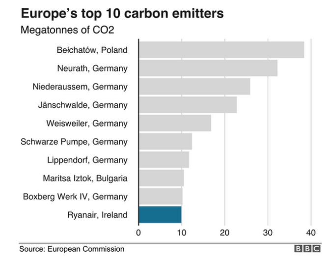 Τα στοιχεία της Ευρωπαϊκής Ενωσης δείχνουν ότι η αεροπορική εταιρία Ryanair βρίσκεται μεταξύ των 10 εταιριών που ρυπαίνουν περισσότερο.
