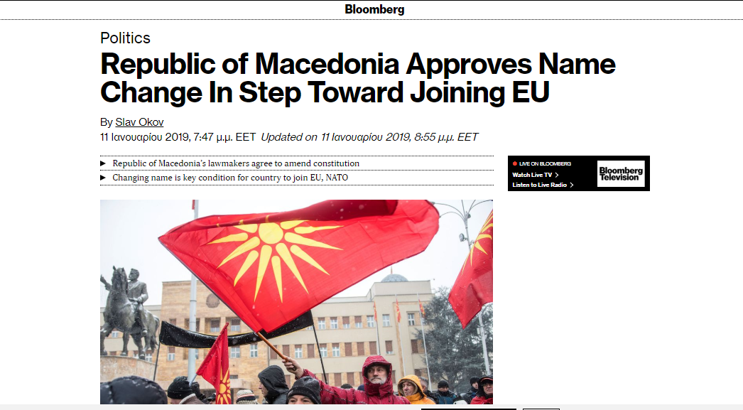 Το Bloomberg τονίζει ότι η κυβέρνηση του Ζόραν Ζάεφ κατάφερε να εξασφαλίσει τη στήριξη στο κοινοβούλιο της χώρας για την επίλυση της επί δεκαετιών διαμάχης με την Ελλάδα.