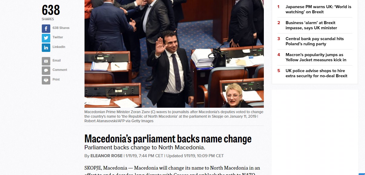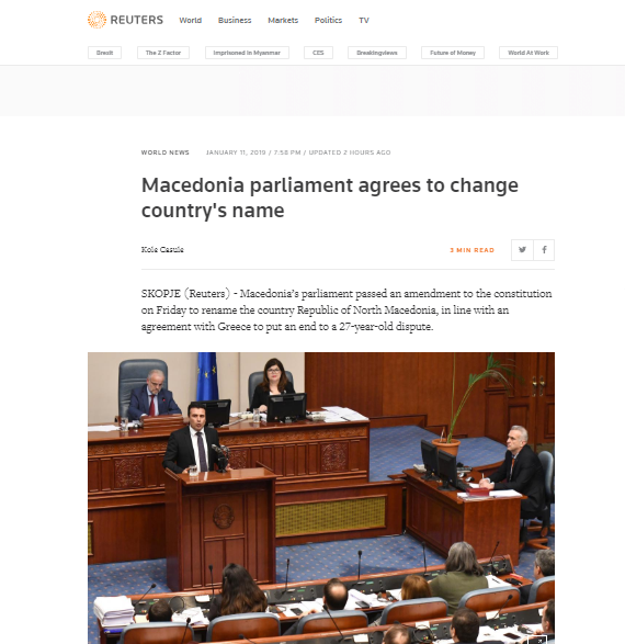 Το πρακτορείο ειδήσεων Reuters παραθέτει σημεία από την εναρκτήρια ομιλία του Ζάεφ στην Βουλή, ότι η αλλαγή ονόματος “θα ανοίξει την πόρτα στο μέλλον”, στο ευρωπαϊκό μέλλον της χώρας και στη συμμετοχή στην Βορειοατλαντική συμμαχία.
