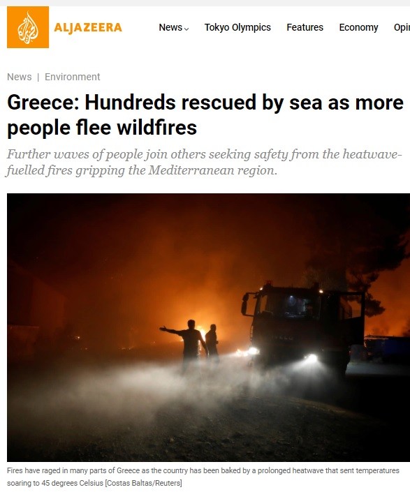 Στο Aljazeera γίνεται αναφορά στην μεγάλη φωτιά που καίει τη Βόρεια Εύβοια και τη διάσωση των κατοίκων από την θάλασσα.