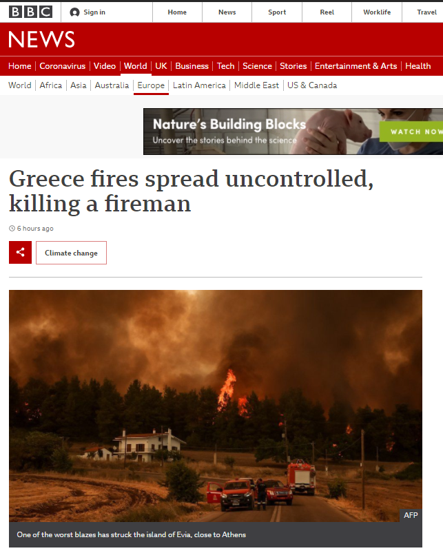 Με τίτλο “Οι φωτιές στην Ελλάδα εξαπλώνονται ανεξέλεγκτα, νεκρός ένας πυροσβέστης” το BBC αναφέρεται στις καταστροφικές φωτιές στην Ελλάδα. “Τεράστια σύννεφα καπνού πλέουν πάνω από τα βόρεια προάστια της Αθήνας, όπου οι άνθρωποι καλούνται να εγκαταλείψουν τα σπίτια τους” μεταδίδει.