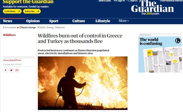 “Ένα παρατεταμένο κύμα καύσωνα έκανε τα δάση προσανάματα και φλόγες απειλούσαν κατοικημένες περιοχές, εγκαταστάσεις ηλεκτρικής ενέργειας και ιστορικά αξιοθέατα.” αναφέρει σε άλλο σημείο.