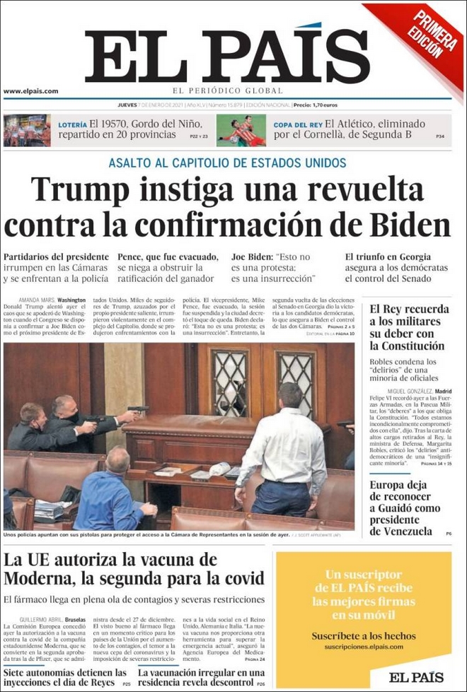 Για τη μεγάλη ισπανική εφημερίδα El Pais, «ο Ντόναλντ Τραμπ ενθάρρυνε χθες το χάος που δημιουργήθηκε στην Ουάσινγκτον την ώρα που το Κογκρέσο ετοιμαζόταν να επικυρώσει τον Τζο Μπάιντεν ως τον επόμενο πρόεδρο των Ηνωμένων Πολιτειών».