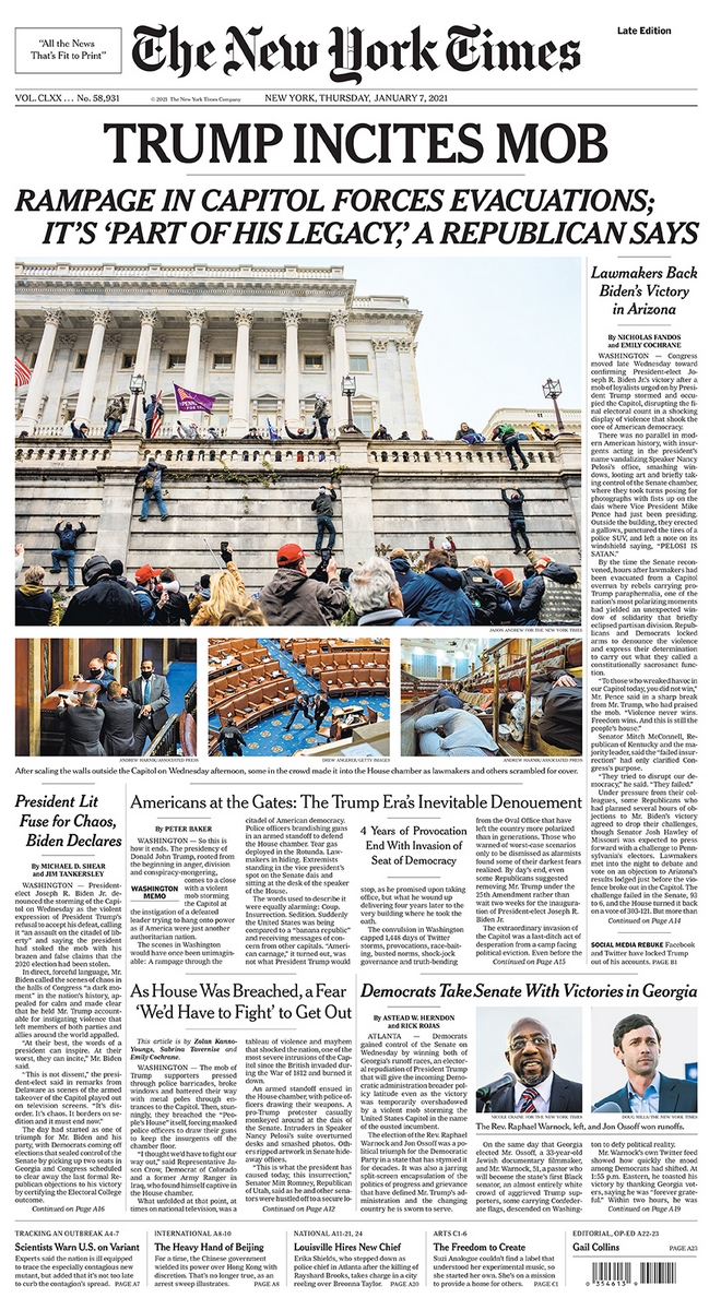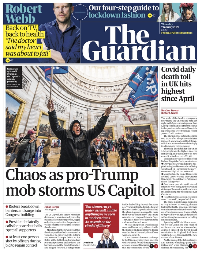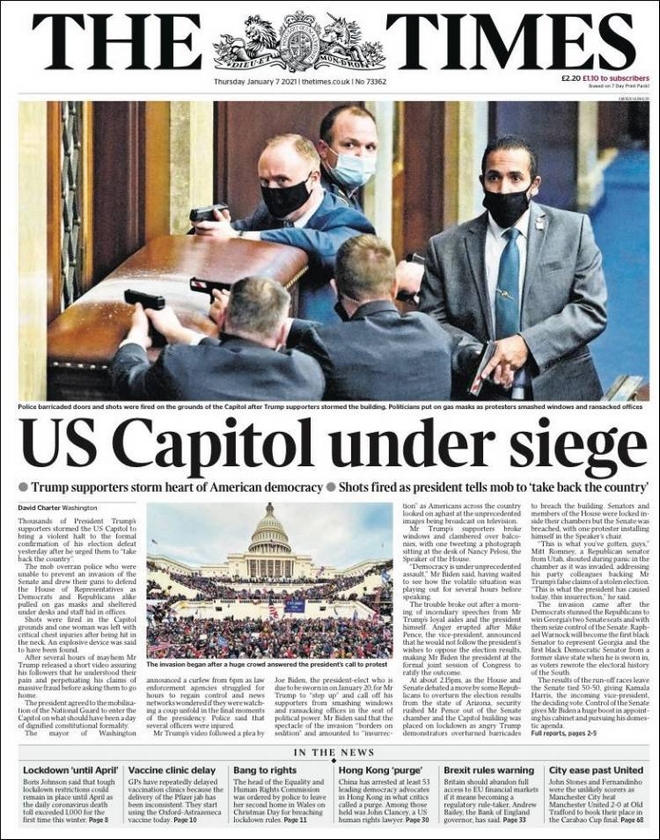 «Το Καπιτώλιο πολιορκημένο – Οι υποστηρικτές του Τραμπ καταλαμβάνουν την καρδιά της αμερικανικής δημοκρατίας», είναι ο τίτλος των Times του Λονδίνου, οι οποίοι περιγράφουν πώς οι δημοκρατικοί και ρεπουμπλικάνοι βουλευτές, που συνεδρίαζαν για να επικυρώσουν την εκλογή του δημοκρατικού Τζο Μπάιντεν, «φόρεσαν αντιασφυξιογόνες μάσκες και βρήκαν καταφύγιο κάτω από τα γραφεία» ενώ το προσωπικό «κρυβόταν μέσα στα γραφεία».