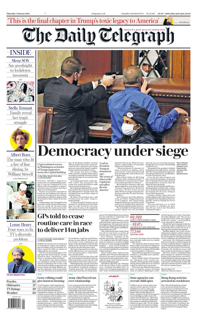 Κάτω από τον τίτλο «Η δημοκρατία υπό πολιορκία», η Daily Telegraph κάνει λόγο για «σκηνές χωρίς προηγούμενο στην Ουάσινγκτον» με «ορδές υποστηρικτών του Τραμπ» να καταλαμβάνουν τον ναό της αμερικανικής διπλωματίας.