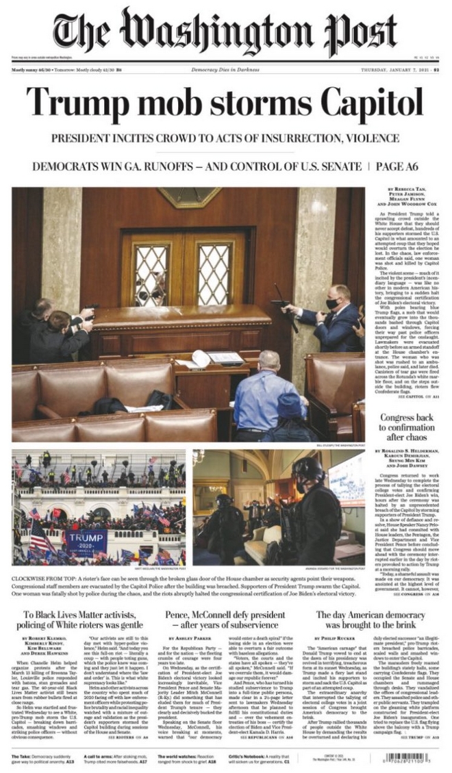 «Η δημοκρατία υπό πολιορκία», «το πραξικόπημα της τρέλας», «ο Τραμπ βάζει φωτιά στην Ουάσινγκτον»: το «χάος», που προκλήθηκε χθες, Τετάρτη, στο Καπιτώλιο από τους οπαδούς του Ντόναλντ Τραμπ, βρίσκεται στις πρώτες σελίδες του διεθνούς Τύπου, που επιρρίπτει την ευθύνη στον απερχόμενο πρόεδρο, τον οποίο κατηγορεί ότι ενθάρρυνε τη βία των οπαδών του.