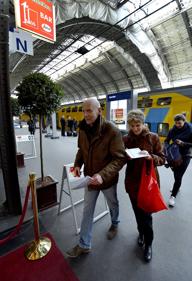 People casts their vote for the Dutch general election in a polling station at the Central Station in Amsterdam, Netherlands, Wednesday, March 15, 2017. (AP Photo/Patrick Post)