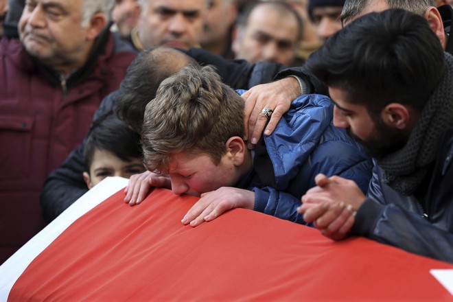2017 AP YEAR END PHOTOS - Family and friends mourn on Jan. 1, 2017, during the funeral for Ayhan Akin, one of the victims of a shooting at a nightclub in Istanbul. An assailant, believed to have been dressed in a Santa Claus costume, opened fire at a nightclub in Istanbul's Ortakoy district during New Year's celebrations, killing dozens of people and wounding dozens of others in what the province's governor described as a terror attack. (AP Photo) AP Photo