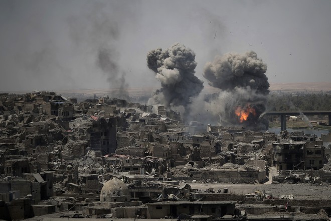 2017 AP YEAR END PHOTOS - Airstrikes target Islamic State positions on the edge of the old city of Mosul, Iraq, on July 11, 2017, a day after Iraq's prime minister declared "total victory" there. (AP Photo/Felipe Dana) AP