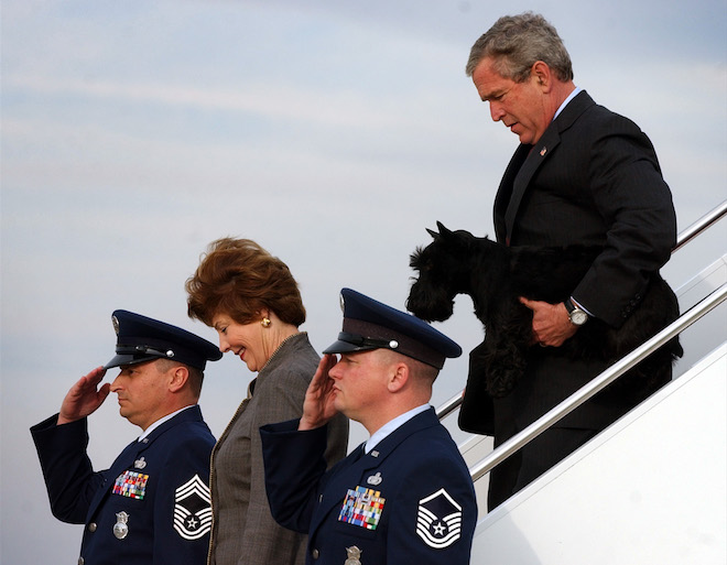 Ο Πρόεδρος Μπους, με την πρώτη κυρία Λάουρα Μπους, μεταφέρει τον σκύλο του Μπάρνεϊ με το Air Force One στη βάση της Πολεμικής Αεροπορίας το 2004, αφού πέρασε την εβδομάδα διακοπών της Πρωτοχρονιάς στο ράντσο του Τέξας. AP