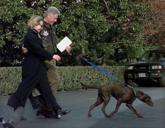 Ο Πρόεδρος Κλίντον, με την πρώτη κυρία Χίλαρι Κλίντον και το προεδρικό κουτάβι Buddy καθώς φεύγουν από τον Λευκό Οίκο, 13 Μαρτίου 1998 AP