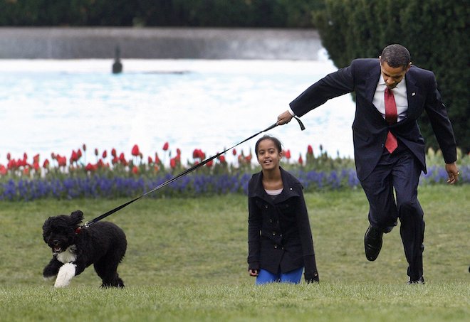 Ο Πρόεδρος Μπαράκ Ομπάμα και η κόρη του Μάλια παίζουν με το νέο σκυλί τους Μπο, στο γκαζόν του Λευκού Οίκου, 14 Απριλίου 2009 AP