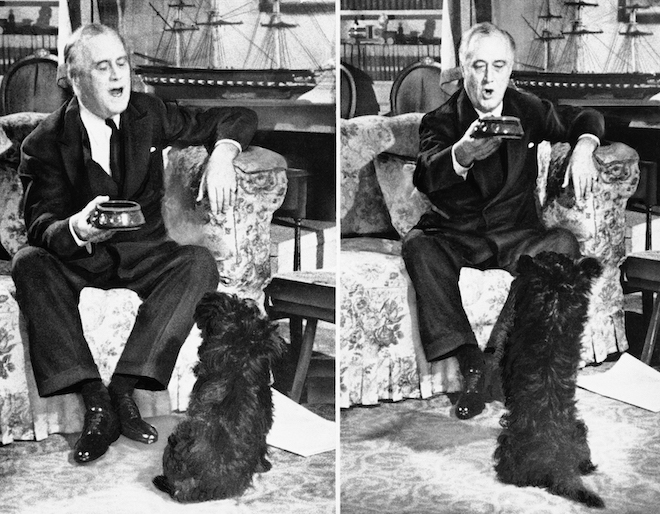 Ο Franklin D. Roosevelt παίζει με το Scotch terrier του, στο Λευκό Οίκο, 1943. AP