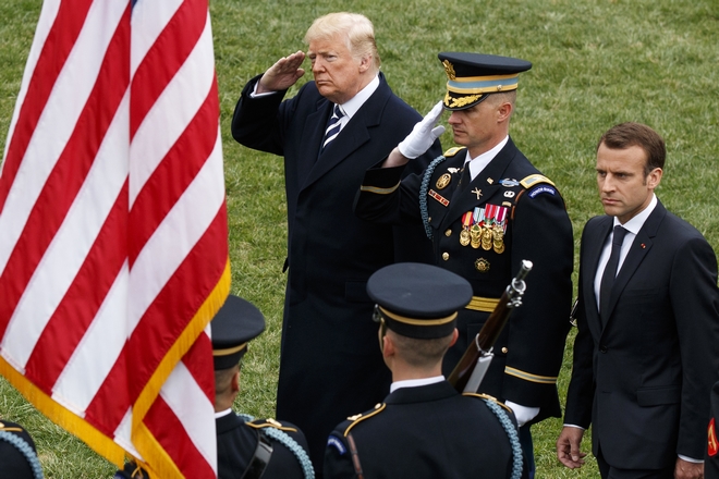 Στην σημερινή επίσκεψη του Μακρόν στον Λευκό Οίκο(εθιμοτυπικά, την δεύτερη ημέρα της επίσκεψης) τον γάλλο Πρόεδρο υποδέχτηκαν επιτροπή πολιτών αλλά και στρατιωτικά τμήματα.