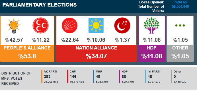 Τα AKP και MHP – κόμμα των Γκρίζων Λύκων – υποστήριξαν τον Ταγίπ Ερντογάν ως προεδρικό υποψήφιο και κατέβασαν κοινές λίστες υποψηφίων βουλευτών στις βουλευτικές εκλογές. Ο Ερντογάν επανεκλέχθηκε με πάνω από 52%, κερδίζοντας τον αντίπαλό του Ιντζέ, από τον πρώτο γύρο και παρά τις καταγγελίες για νοθεία. Ξεπέρασε μάλιστα τις προβλέψεις που έκαναν λόγο για αναμέτρηση σε δεύτερο γύρο. Στις δε βουλευτικές, το κόμμα του Ερντογάν παίρνει μεν την πλειοψηφία (χωρίς αυτοδυναμία), αλλά σε συνεργασία με τον ακροδεξιό εταίρο του, από τον οποίο θα εξαρτάται εν πολλοίς.