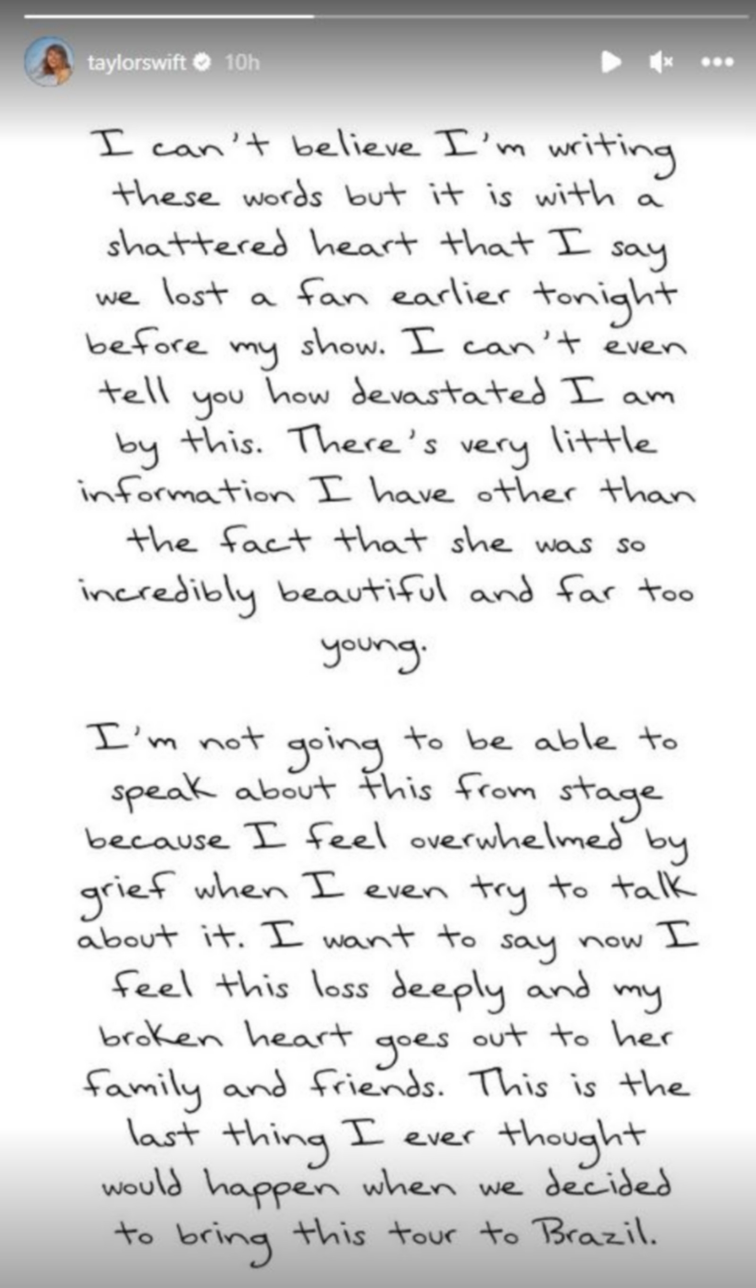 Την τελευταία της πνοή στο Olímpico Nilton Santos του Ρίο ντε Τζανέιρο, λίγο πριν η Taylor Swift εμφανιστεί στη σκηνή, άφησε μία 23χρονη φαν της τραγουδίστριας που βρέθηκε στο στάδιο για να παρακολουθήσει την πολυαναμενόμενη συναυλία της.
