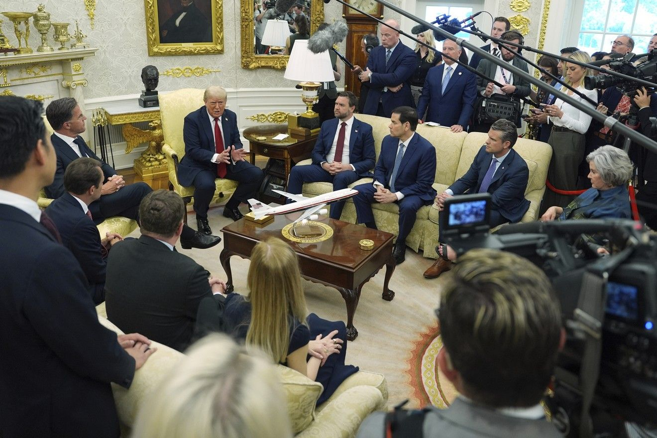 Ο Τραμπ συνέχισε επαινώντας το ΝΑΤΟ, αναφέροντας την πρόσφατη συμφωνία για αμυντικές δαπάνες 5% μέχρι το 2035. Ο πρόεδρος των ΗΠΑ πρόσθεσε ότι «κάναμε πολλούς φίλους εκεί» και σημείωσε ότι κάποιες από τις χώρες διαθέτουν «σπουδαίους ανθρώπους» και ότι «κατά κανόνα, είναι πολύ ισχυρές και σταθερές χώρες».