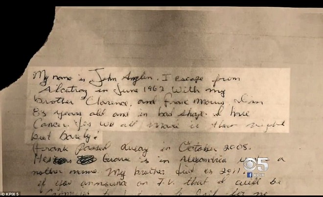 ” Το όνομά μου είναι John Anglin. Απέδρασα από το Αλκατράζ τον Ιούνιο του 1962 μαζί με τον αδερφό μου Clarence και τον Frank Morris. Είμαι 83 ετών και σε κακή κατάσταση. Έχω καρκίνο. Ναι, εκείνο το βράδυ της απόδρασης επιβιώσαμε όλη. Ο Frank πέθανε τον Οκτώβριο του 2005. Ο τάφος του είναι στην Αλεξάνδρεια και έχει άλλο όνομα. Ο αδερφός μου πέθανε το 2011. Εάν ανακοινώσετε στην τηλεόραση ότι θα πάω στη φυλακή για όχι περισσότερο από ένα χρόνο και θα έχω ιατρική περίθαλψη, τότε θα σας γράψω ξανά για να σας ενημερώσω πού ακριβώς βρίσκομαι. Δεν πρόκειται για κάποιο αστείο, αλλά για μία ειλικρινής αλήθεια“. Μέσα στο γράμμα, περιγράφει τα χρόνια που έζησε στο Σιάτλ και την Βόρεια Ντακότα, ενώ αναφέρει ότι τώρα ζει στη Νότια Καλιφόρνια.