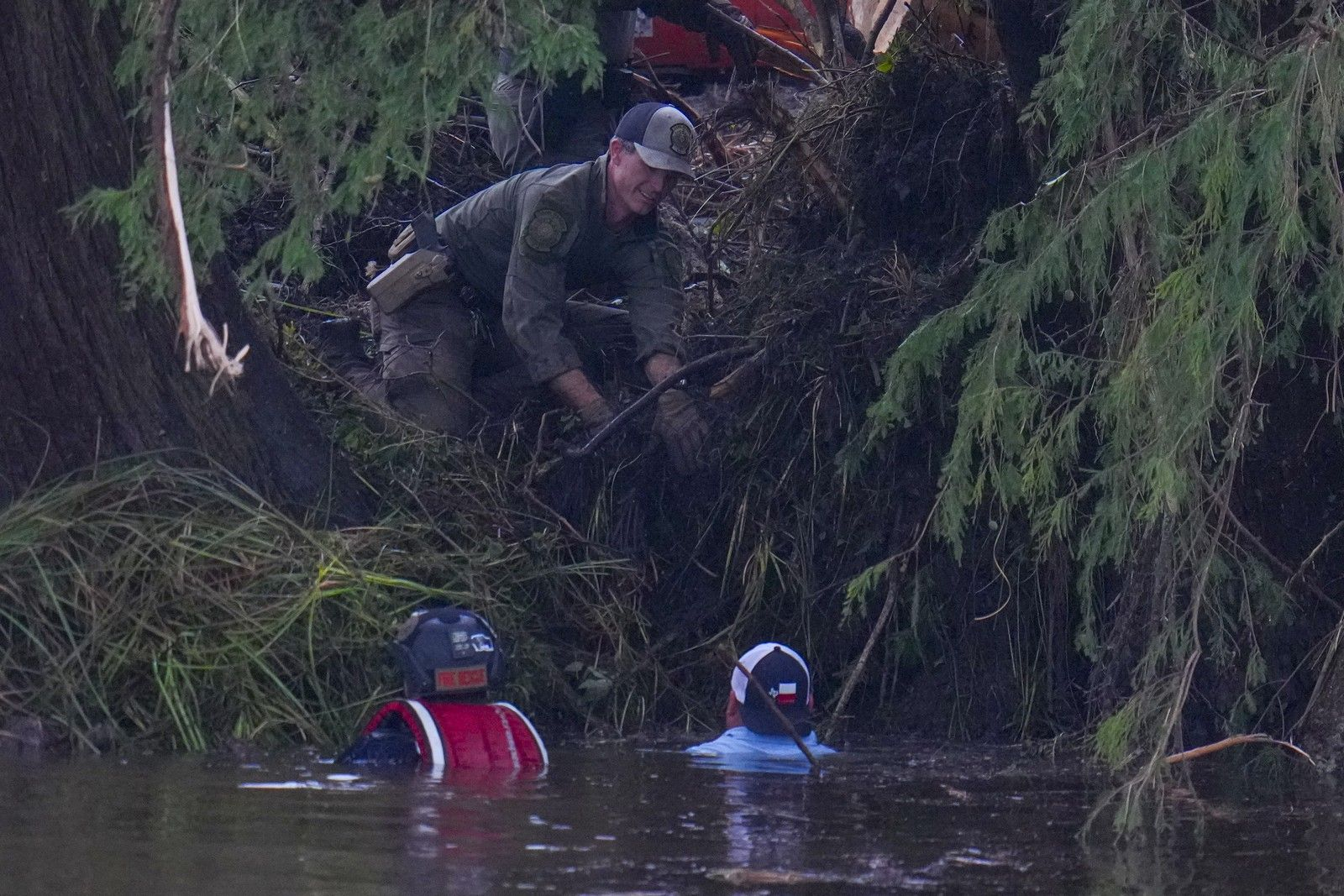 Τα μεταβαλλόμενα επίπεδα νερού και τα συντρίμμια από την καταιγίδα δημιουργούν επικίνδυνες συνθήκες για τους διασώστες, οι οποίοι συνεχίζουν την αναζήτηση αγνοουμένων, σύμφωνα με εθελοντή από την United Cajun Navy, μια εθελοντική ομάδα διάσωσης από τη Λουιζιάνα που βοηθά στην επιχείρηση έρευνας και διάσωσης στο Κέρβιλ.