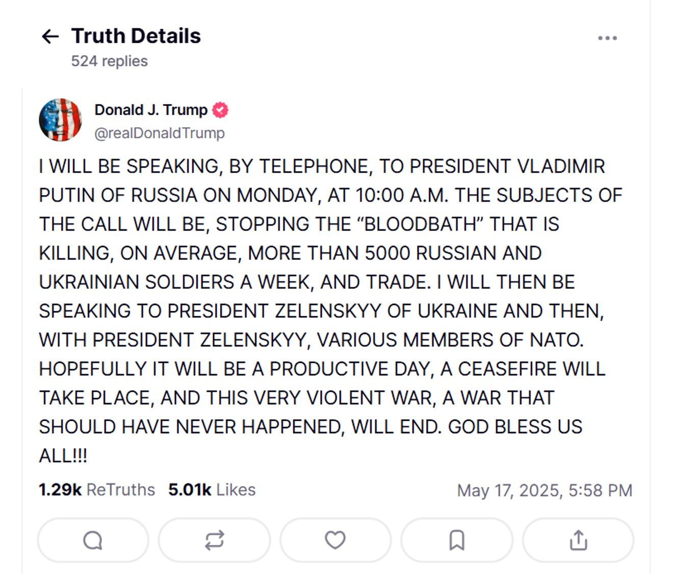 Για αύριο, Δευτέρα (19/05) είναι προγραμματισμένη η κρίσιμη τηλεφωνική επικοινωνία Τραμπ και Πούτιν με στόχο τον τερματισμό του πολέμου στην Ουκρανία.