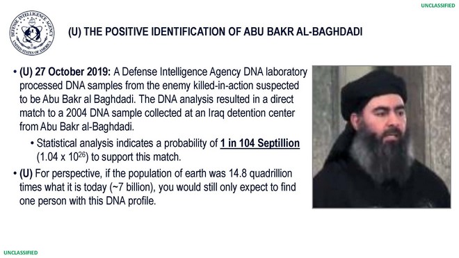 Με το σώμα του Μπαγκντάντι «ακρωτηριασμένο από τις εκρήξεις», οι αμερικανικές δυνάμεις έκαναν εξέταση DNA για να επιβεβαιώσουν την ταυτότητά του σε περίπου 15 λεπτά. «Τα αποτελέσματα της εξέτασης επιβεβαίωσαν την ταυτότητά του με τρόπο βέβαιο, άμεσο και απόλυτα θετικό. Ήταν εκείνος» σημείωσε ο Τραμπ.