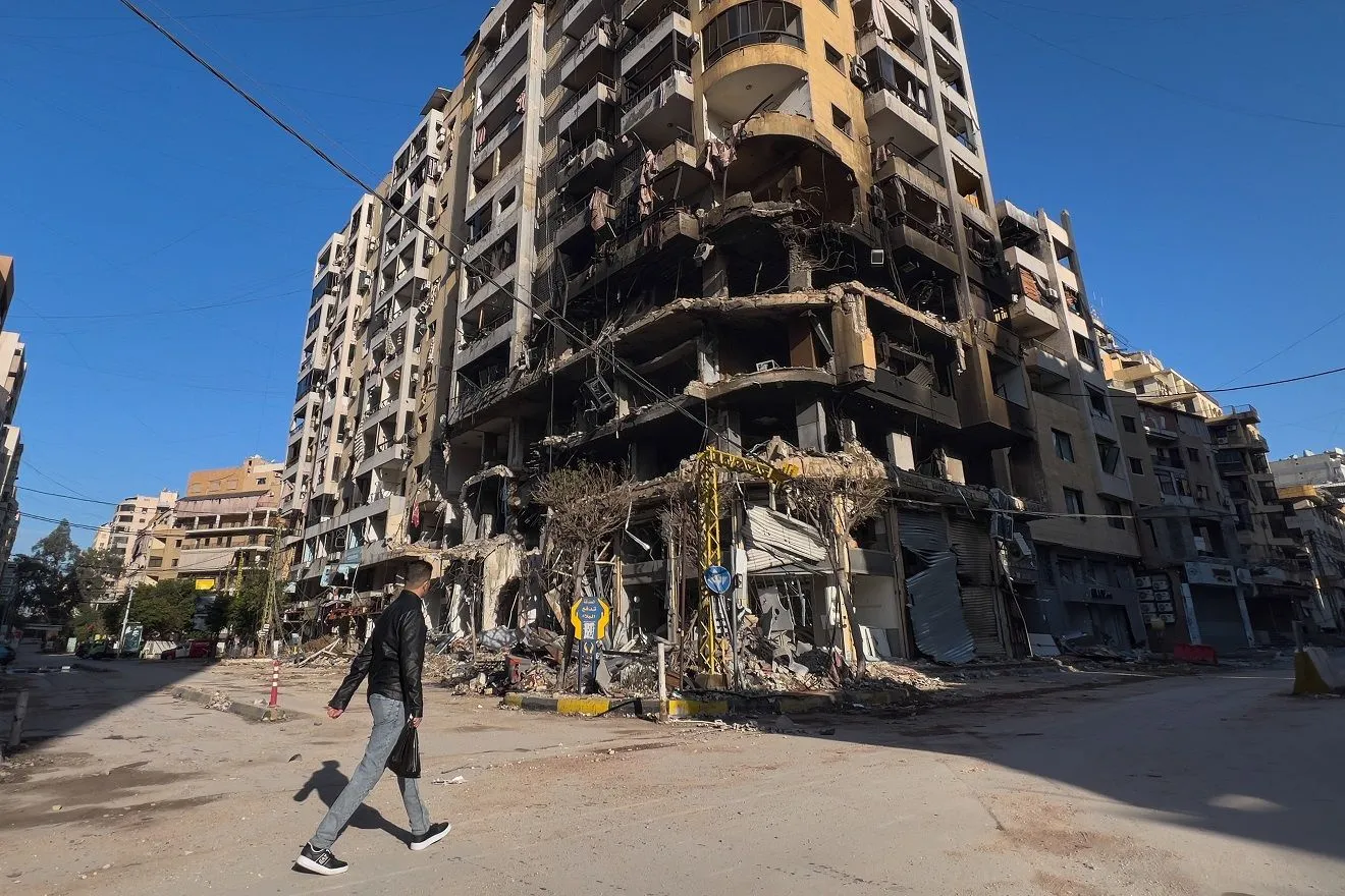 A man passes in front of a destroyed building that was hit by an Israeli airstrike in Dahiyeh, Beirut's southern suburbs, Lebanon, Tuesday, March 24, 2026. (AP Photo/Hussein Malla)