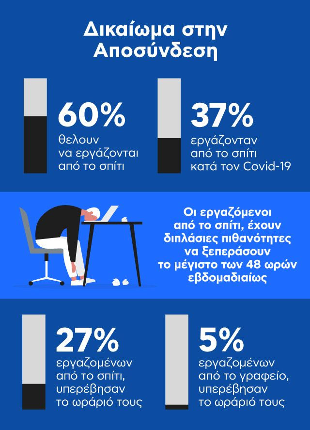 Η ανάπαυση είναι ζωτικής σημασίας για την ευεξία και η αδιάκοπη σύνδεση των εργαζομένων έχει αρνητικές συνέπειες στην υγεία τους. Η υπερβολική χρήση οθόνης και ο μεγάλος φόρτος εργασίας επηρεάζουν τη συγκέντρωση, οδηγούν σε γνωστική και συναισθηματική κόπωση, προκαλώντας πονοκεφάλους, αϋπνίες και άγχος. Επιπλέον, η κακή εργονομία κατά την εργασία από το σπίτι αυξάνει τον κίνδυνο μυοσκελετικών προβλημάτων, κάνοντας επιτακτική την ανάγκη για κατάλληλες συνθήκες εργασίας.