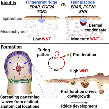 Παρακολουθώντας την ανάπτυξη δακτυλικών αποτυπωμάτων σε εμβρυϊκά ποντίκια (και ανθρώπινα κύτταρα σε ένα πιάτο Petri στο εργαστήριο), οι ερευνητές μπόρεσαν να δουν ότι οι ραβδώσεις αναπτύχθηκαν και λειτουργούσαν η μία ενάντια στην άλλη, σε τρία διαφορετικά μέρη του άκρου του δακτύλου: την άκρη, το κέντρο και το σημείο που είναι πιο κοντά στην επάνω άρθρωση.
