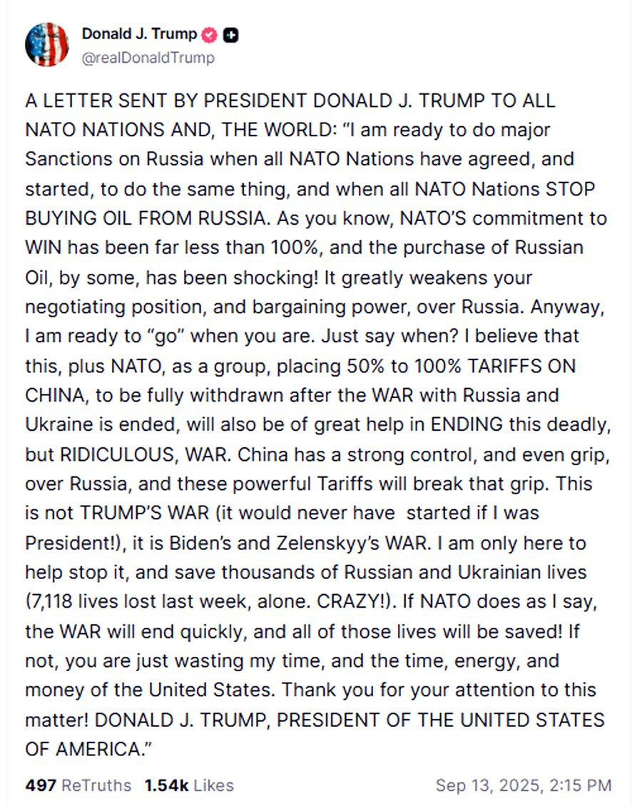 Ο Αμερικανός πρόεδρος Ντόναλντ Τραμπ απηύθυνε ένα είδος… τελεσίγραφου το Σάββατο (13/09) στους συμμάχους του ΝΑΤΟ, με σχετική επιστολή που απέστειλε, στην οποία έλεγε ότι οι ΗΠΑ θα επιβάλουν «σημαντικές» κυρώσεις στη Ρωσία μόνο όταν συμφωνήσουν να κάνουν το ίδιο και όταν σταματήσουν να αγοράζουν πετρέλαιο από τη Ρωσία.