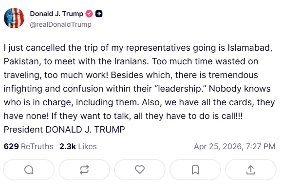 Ο πρόεδρος Ντόναλντ Τραμπ δήλωσε το Σάββατο ότι οι Αμερικανοί διαπραγματευτές Στιβ Γουίτκοφ και Τζάρεντ Κούσνερ δεν θα μεταβούν πλέον στο Πακιστάν για συνομιλίες με το Ιράν, λίγο αφού έγινε γνωστό πως αποχώρησε από το Ισλαμαμπάντ η Ιρανική αντιπροσωπεία. Η εξέλιξη αυτή επιβεβαιώνει πως οι δύο πλευρές απέχουν πολύ από κάποια συμφωνία για τον τερματισμό του πολέμου.