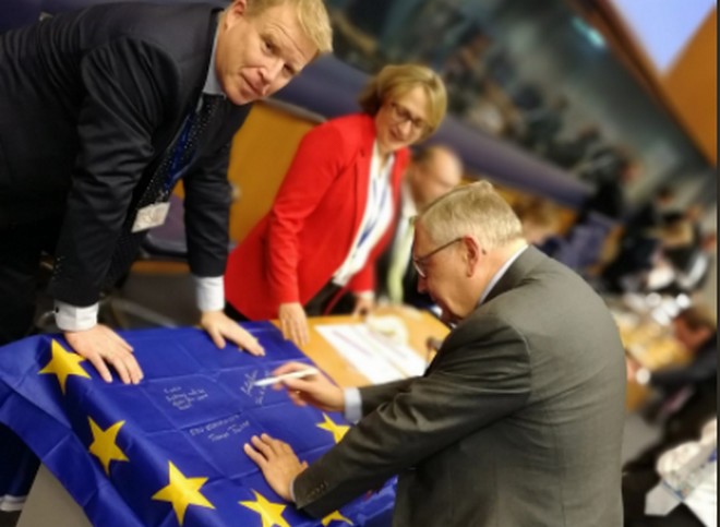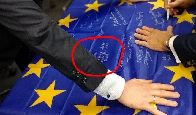 Μια σημαία της ΕΕ με τις υπογραφές και τις αφιερώσεις των υπουργών οικονομικών της Ευρωζώνης ήταν το δώρο του Eurogroup στον απερχόμενο Β. Σόιμπλε. Με έναν άσπρο μαρκαδόρο, όλοι οι συμμετέχοντες έγραψαν μια ευχή στον κραταιό υπουργό Οικονομικών.