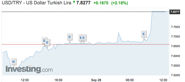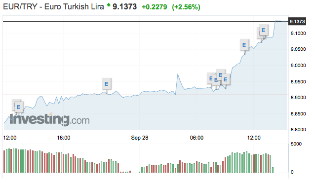 Πλέον οι Τούρκοι για να αγοράσουν 1 ευρώ χρειάζονται του 9,15 λίρες (σ.σ. το προηγούμενο κλείσιμο ήταν στις 8,9 λίρες και μέσα σε λίγες ώρες έπεσε το κάστρο των 9 με την ψαλίδα να ανοίγει όσο προχωράει η μέρα) ενώ για την αγορά ενός δολαρίου οι γείτονες μας θα χρειαστούν 7,83 μονάδες του εθνικού τους νομίσματος. Τις τελευταίες ώρες μάλιστα πληροφορίες θέλουν την Τουρκία να βρίσκεται ένα βήμα πριν την επιβολή capital controls.