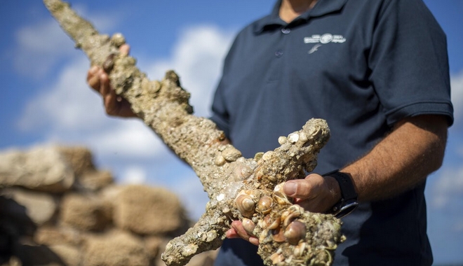 Συγκεκριμένα, ο Σλόμι Κάτζιν, κάτοικος του Άτλιτ στο Ισραήλ, ήταν αυτός που ανακάλυψε αρχαία τεχνουργήματα στο βυθό της θάλασσας, κατά τη διάρκεια καταδύσεων στις ακτές της Καρμέλ στην Χάιφα το περασμένο Σάββατο, όπου ξαφνικά είδε μπροστά του μια αρχαία πέτρα και μεταλλικές άγκυρες, θραύσματα αγγείων και το μεγαλοπρεπές αυτό σπαθί. Οι θησαυροί είχαν προφανώς βγει στην επιφάνεια από τα κύματα και τα ρεύματα που μετατόπισαν την άμμο στο βυθό της θάλασσας.